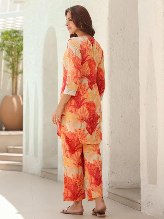 • This co-ord set for women stylish features a vibrant orange tropical print, delivering a bold, fashionable look. With a straight style type and a V-neck design, this co-ord set adds a touch of modern elegance, making it perfect for a variety of occasions.