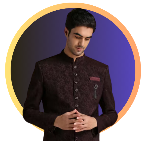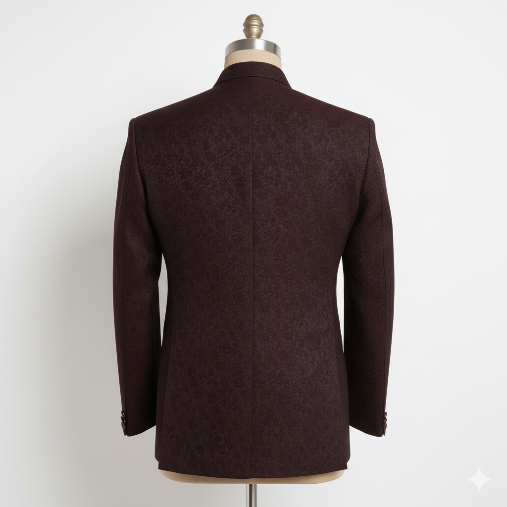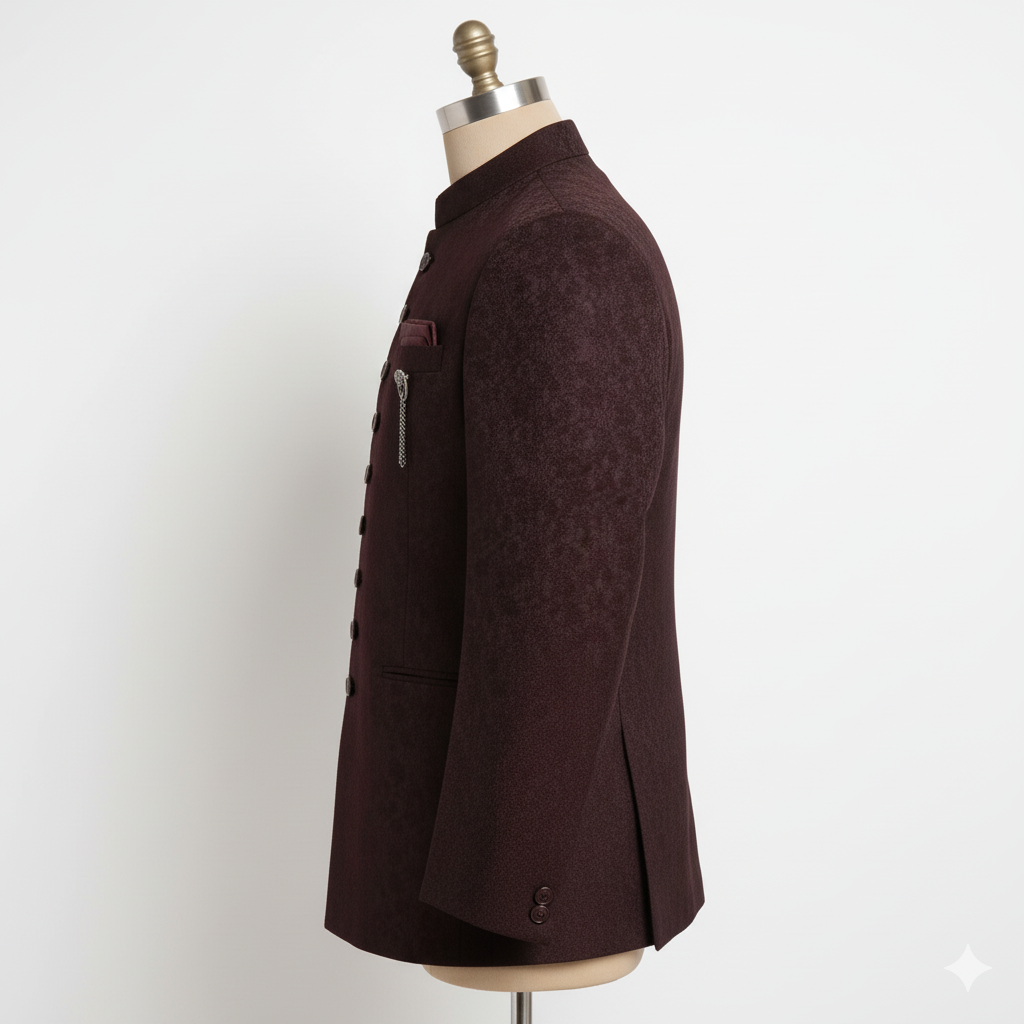 Step into any event with royal authority wearing this Premium Maroon Bandhgala Jacket. It's the ultimate fusion of Indian heritage and sharp contemporary tailoring. Crafted from a rich, textured brocade fabric, it features a subtle self-woven pattern that gives it a luxurious, deep luster, perfect for evening wear.