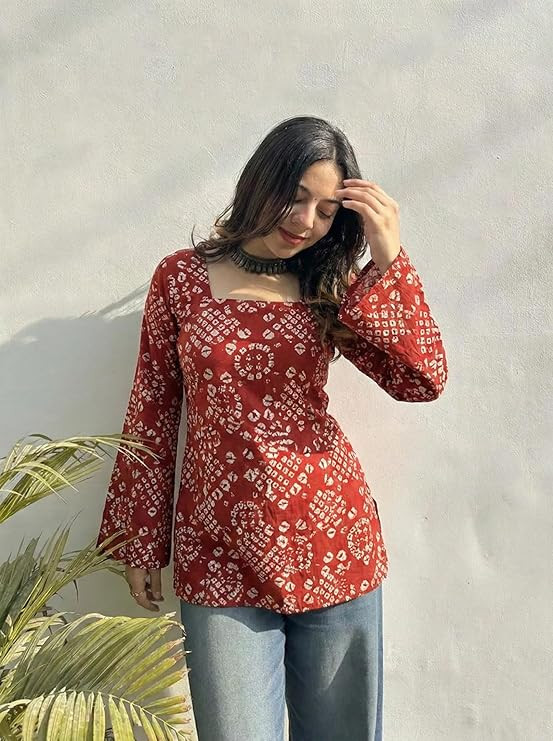 Printed Short Kurti | Straight Fit Ethnic Top with Square Neck | Bell Sleeve Casual Indian Kurta for Office College, Party