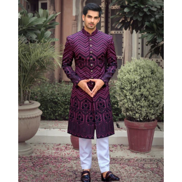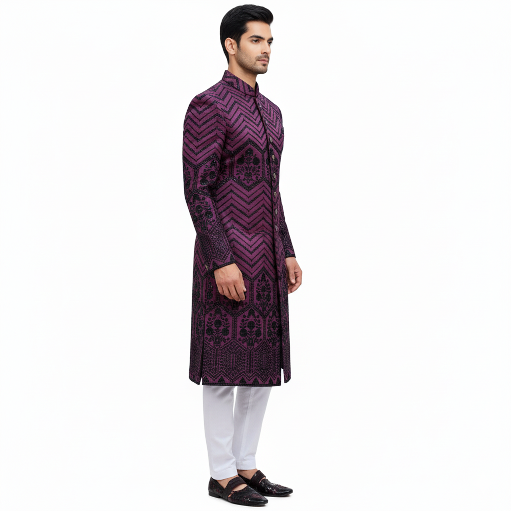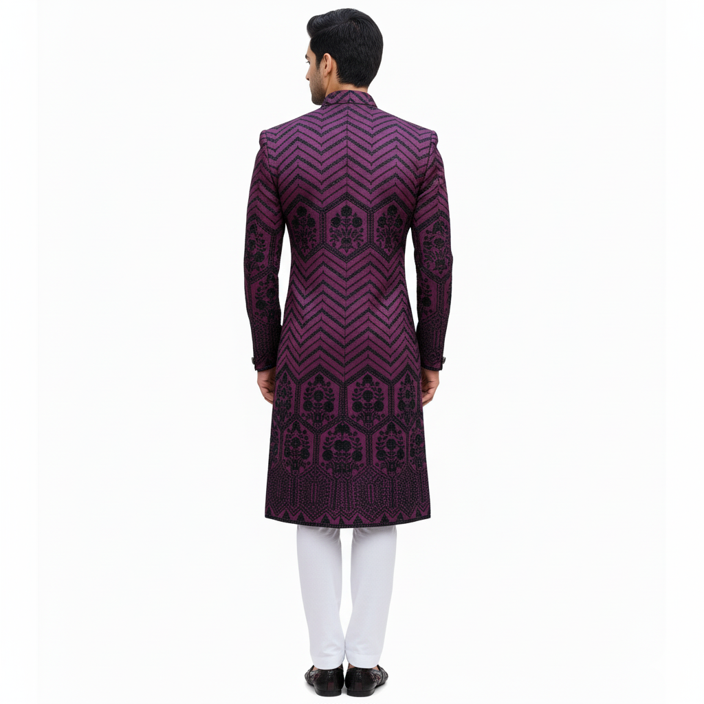 Embellishment- Features heavy black embroidery forming a striking geometric chevron pattern and detailed floral or motif work across the length of the sherwani.