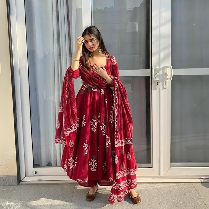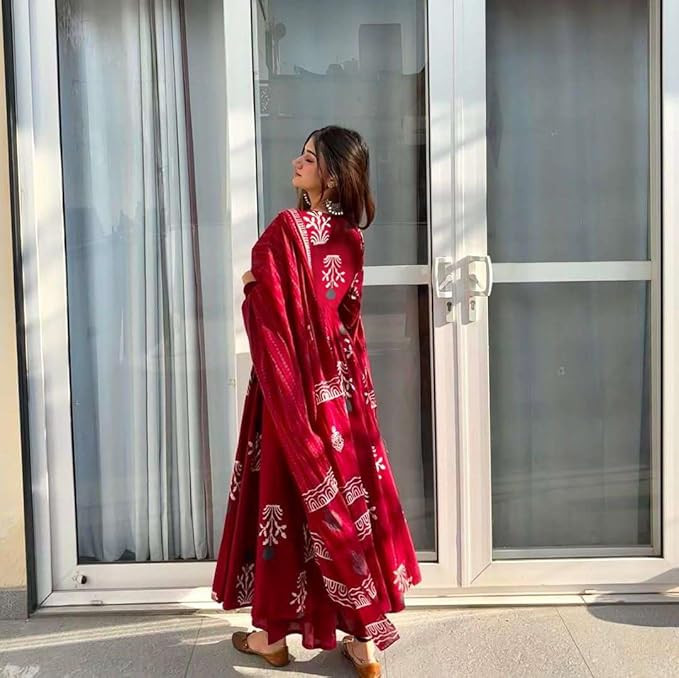 Rayon Anarkali Printed Kurta Pant Dupatta Set | Stylish Cotton Kurti Set for Women | Ethnic Co-ord Suit Set with Dupatta Festive Kurta Sets for Women