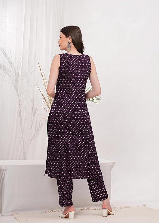 Women's Sleeveless Ikat Print Cotton Kurta & Pant || Black Diamond Pattern || Printed Kurta Set for Ladies