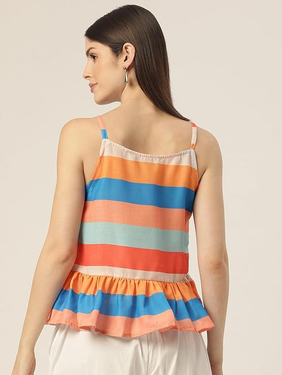 • Cropped length perfect for pairing with high-waisted pants or skirts, Sleeveless design with straps adds a touch of elegance, Peplum hem creates a flirty and feminine silhouette, Digital print adds a modern and trendy element.