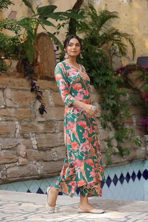 • This set includes: 1 Kurta with 1 Pant || Work: Printed || Neck Style: - V-Neck