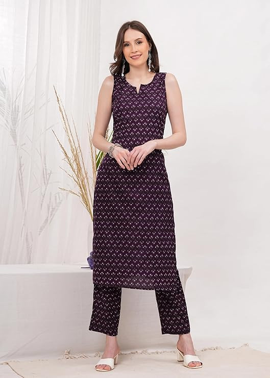 Women's Sleeveless Ikat Print Cotton Kurta & Pant || Black Diamond Pattern || Printed Kurta Set for Ladies