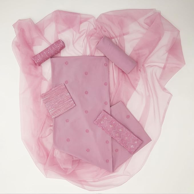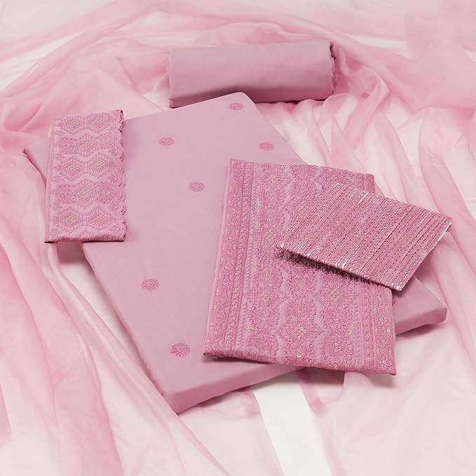 Women's Unstitched Embroidered Cotton Kurta Pant Set with Organza Dupatta