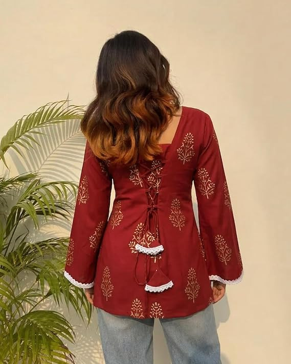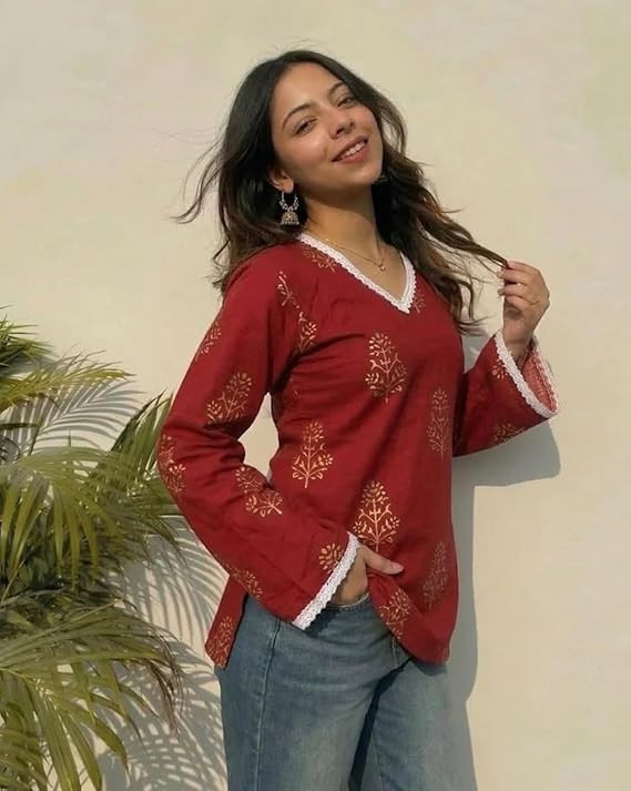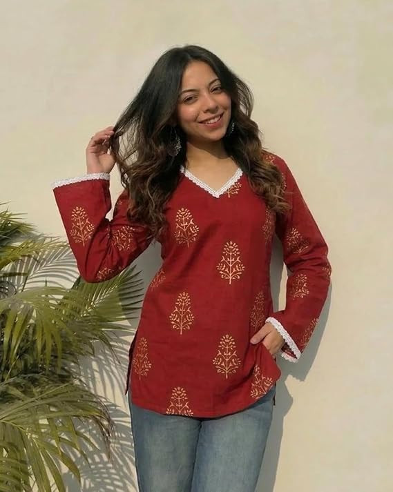 Women's Viscose Printed Short Kurti | Red Buta Print Tunic Top | V Neck Lace Detail | Full Sleeve Hip Length Kurta Top for Women